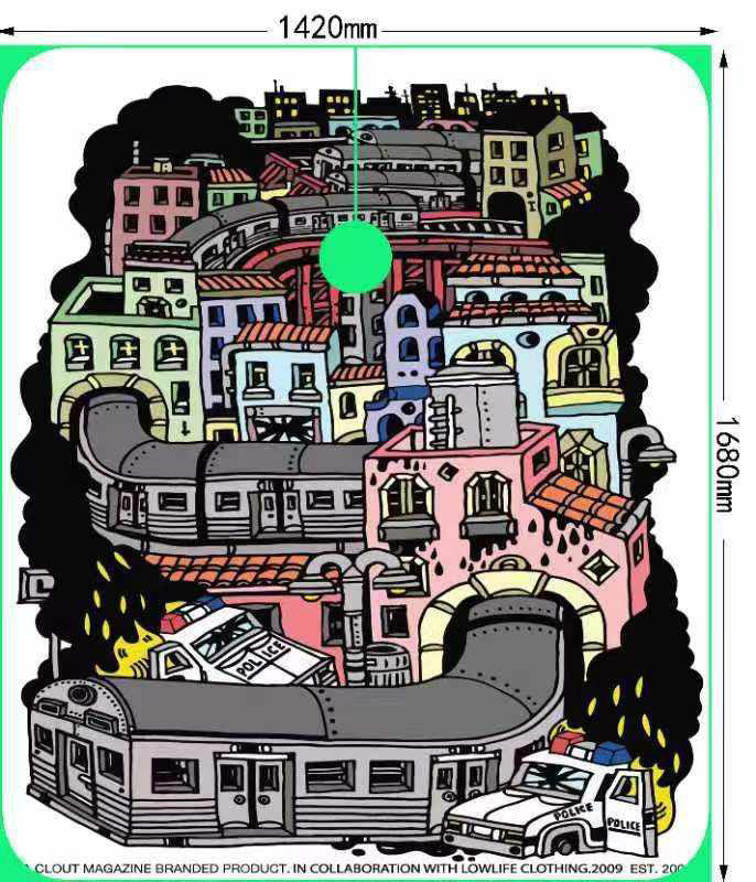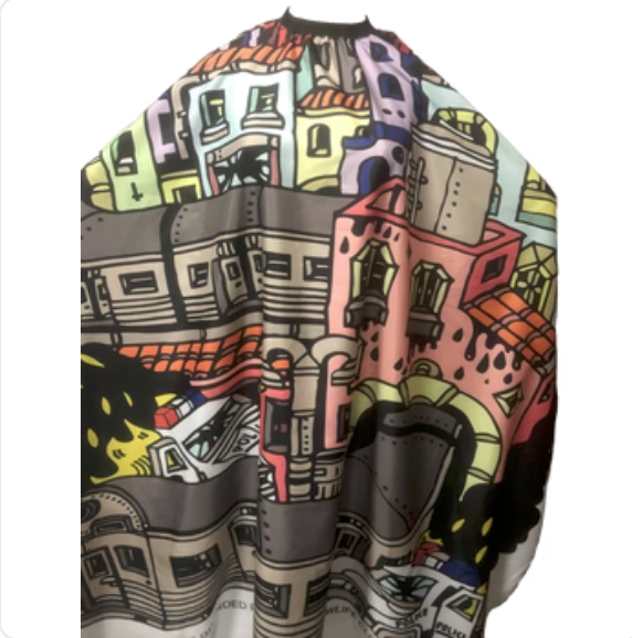 Capa de barbero impermeable con logo Clout Magazine Og. Confeccionado en pongee de poliéster con cuello elástico y ganchos metálicos. La medida de la capa es de 160cm x 140cm.