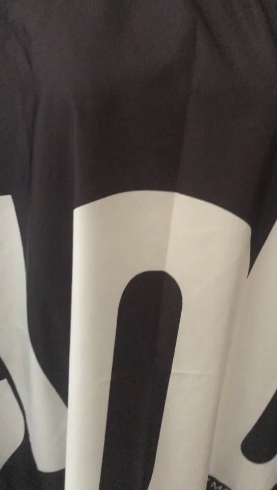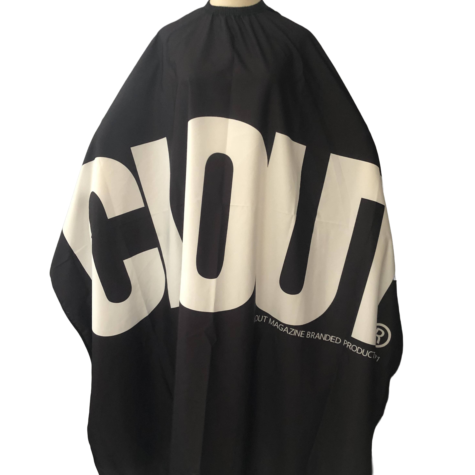 Capa de barbero impermeable con el logo del encabezado de la revista Clout. Confeccionado en pongee de poliéster con cuello elástico y ganchos metálicos. La medida de la capa es de 160cm x 140cm.