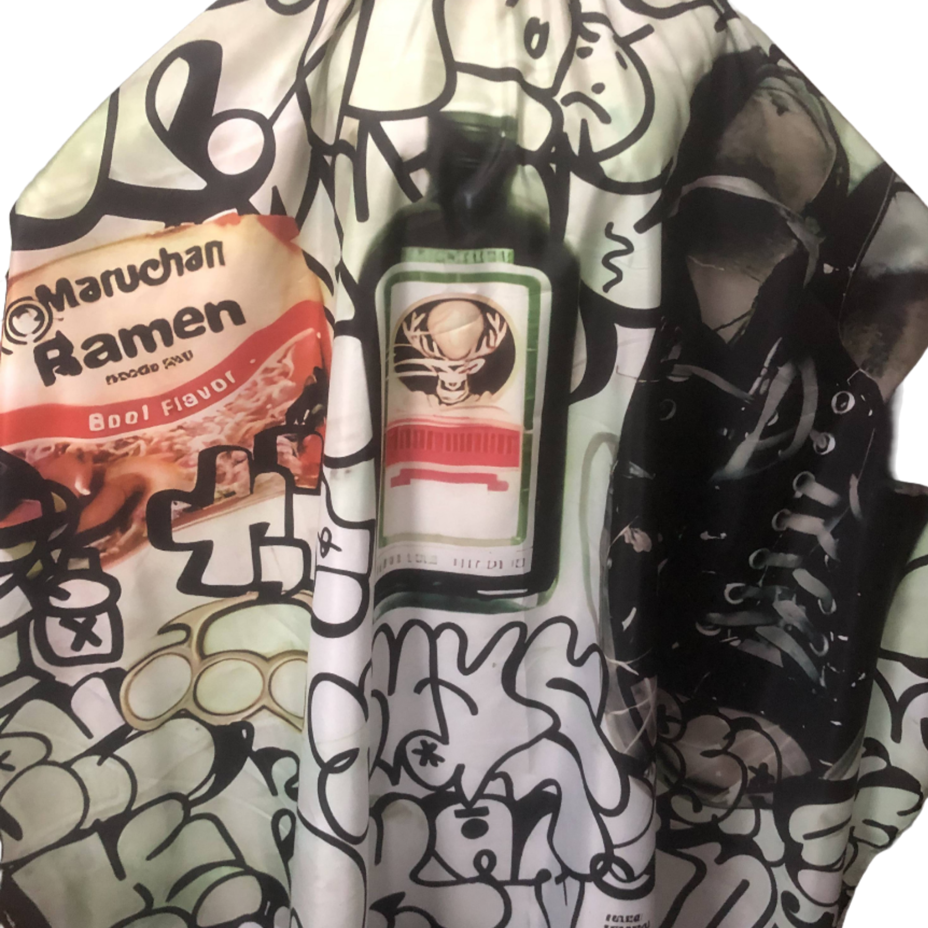 Capa de barbero impermeable del número 5 de la revista Clout. Confeccionado en pongee de poliéster con cuello elástico y ganchos metálicos. La medida de la capa es de 160cm x 140cm.